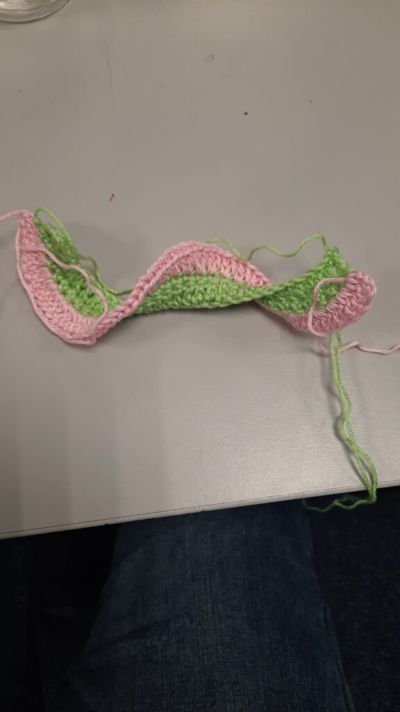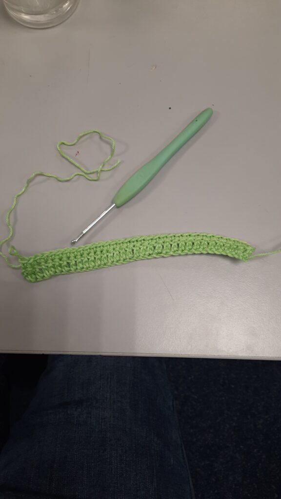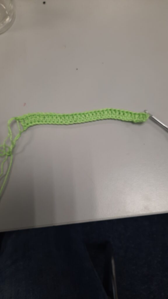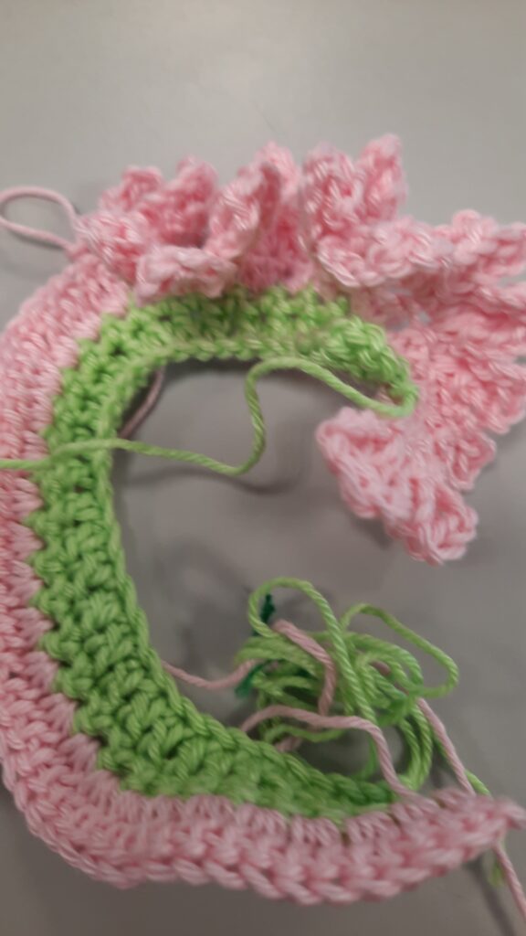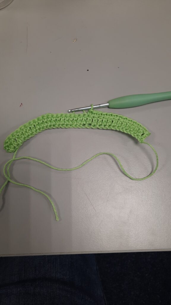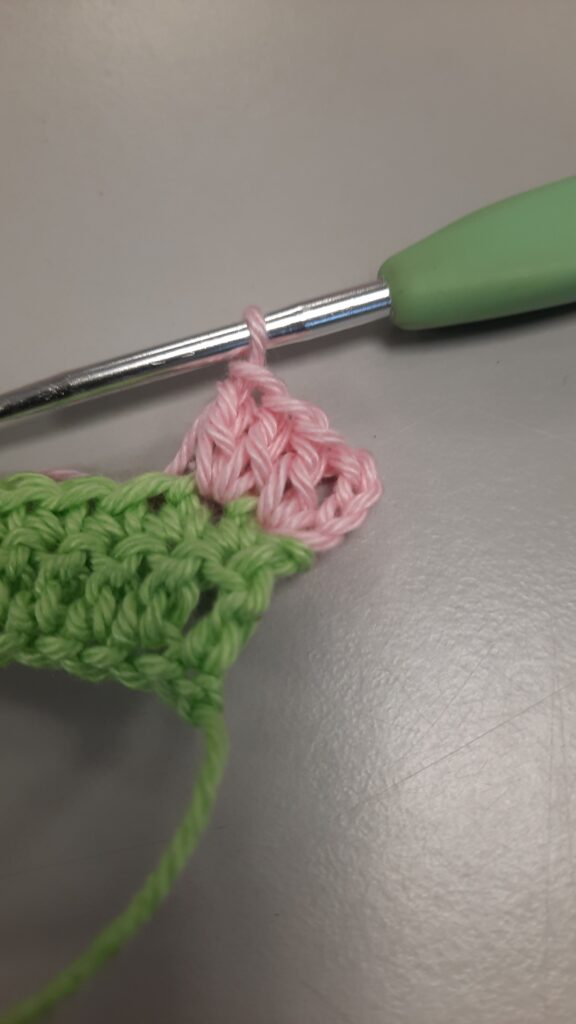 Je begint te haken met groen, houd een iets langer stuk begindraad. Die heb je later nodig.