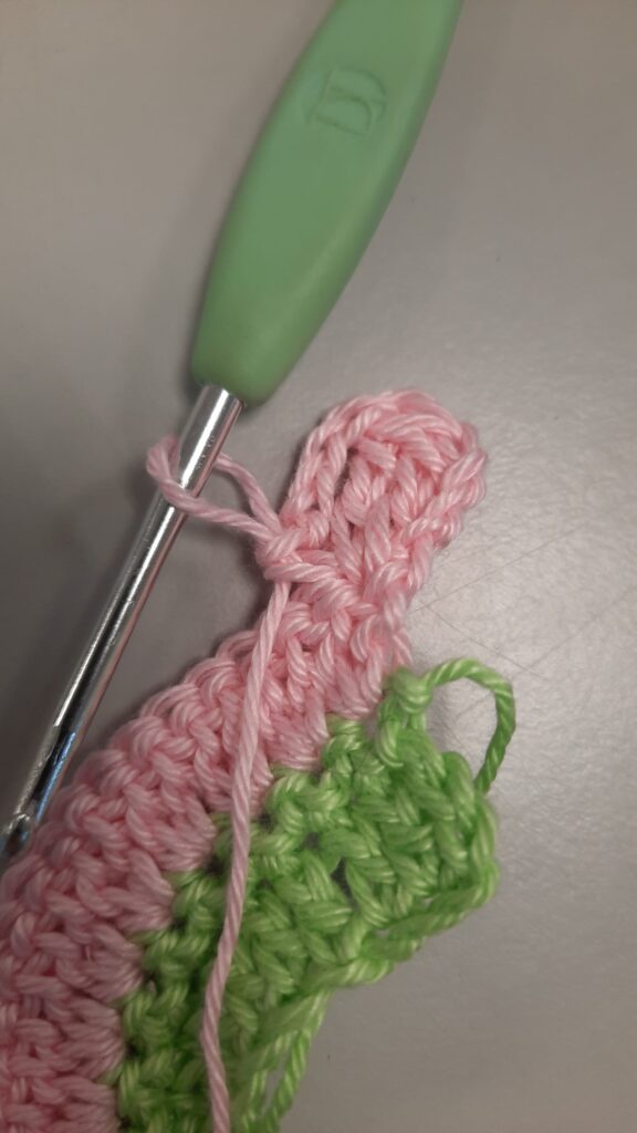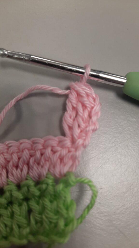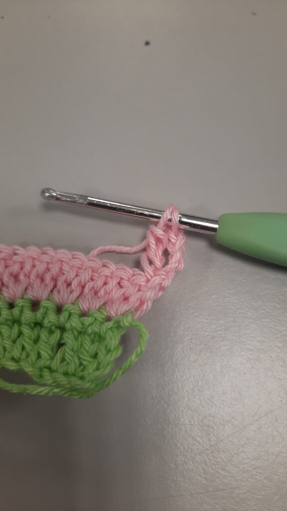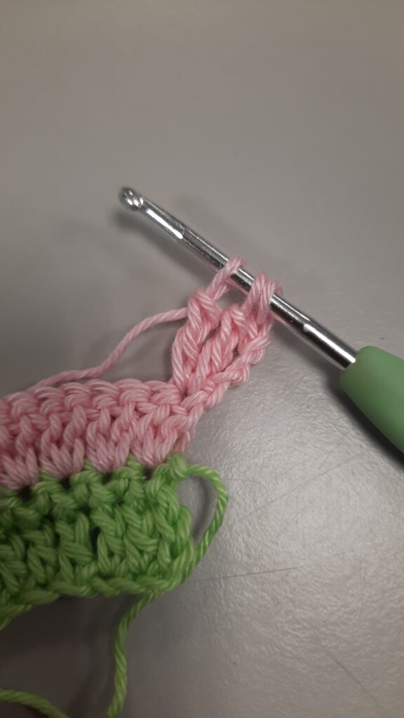 1. Je gaat beginnen met groen, de bedoeling is dat je hakend opzet. (dit vervangt een lossenketting met een rij vasten er op) Haak twee lossen. Dan een vaste in de eerste losse. Nu zie je twee lusjes, haal de draad door de lus het verst van de haaknaald en haak een vaste. (zie foto hieronder) Haak zo een strook van 30 cm. De laatste vaste haak je met de nieuwe kleur.