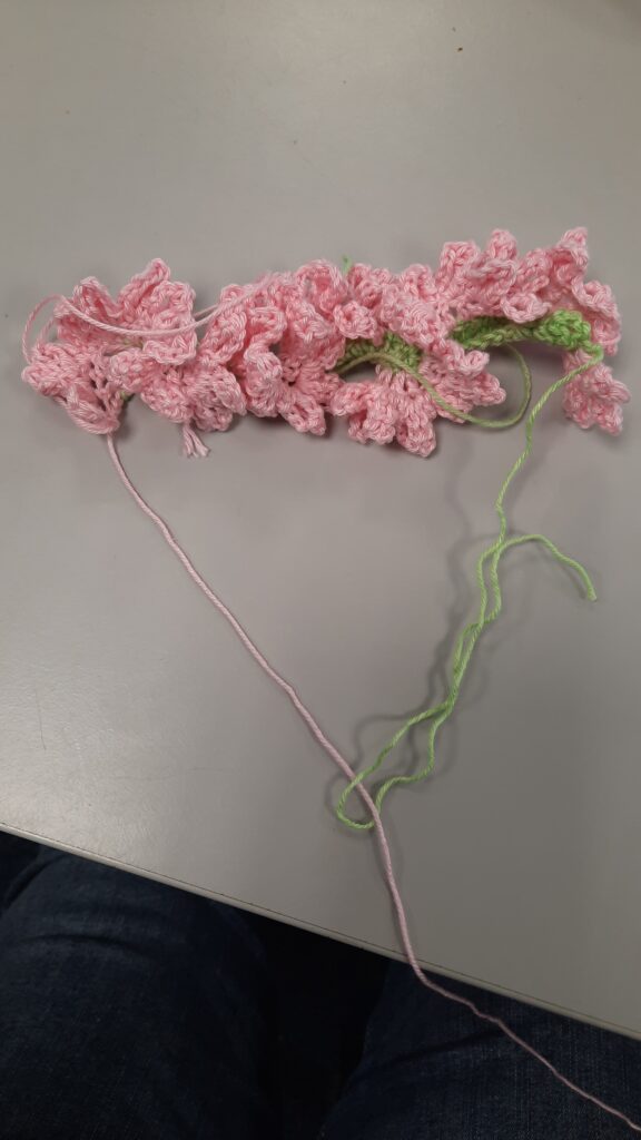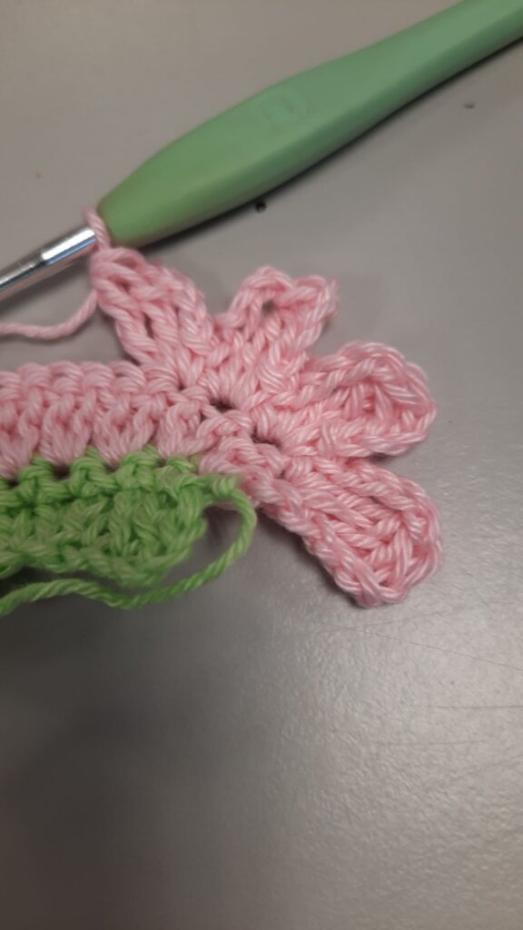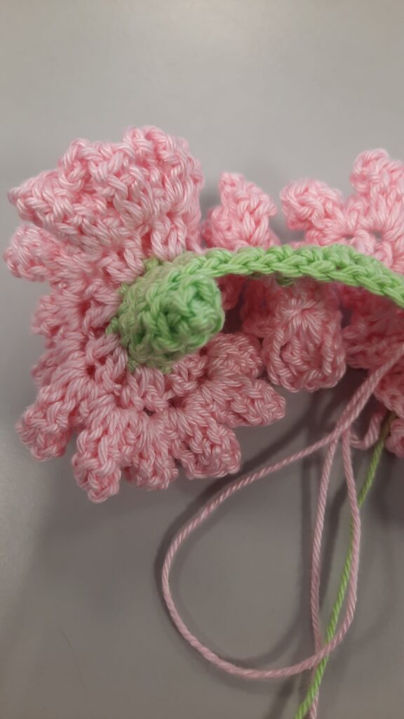 Haak verder met bloemkleur. Je haakt aan de goede kant, dus waar begindraad rechts zit..