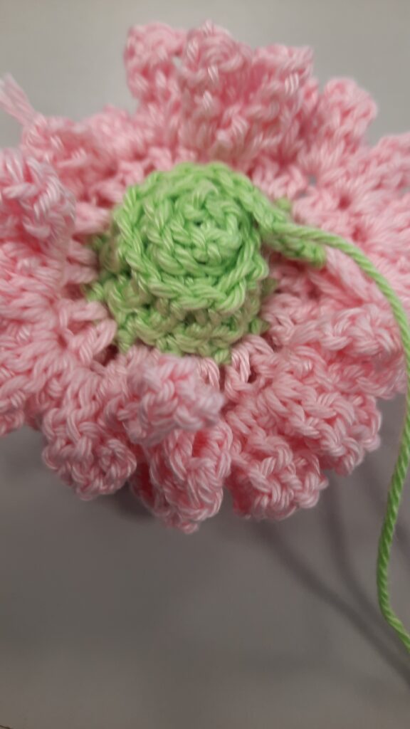 Klaar ben je met de eerste bloem van bloemen haken 2 – dahlia en lange lavendel.
