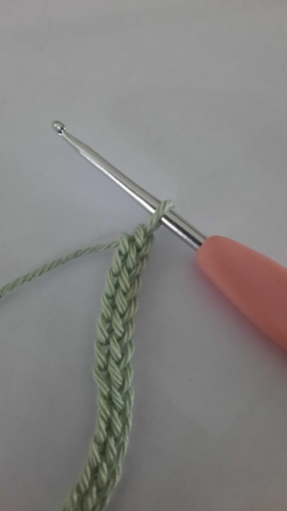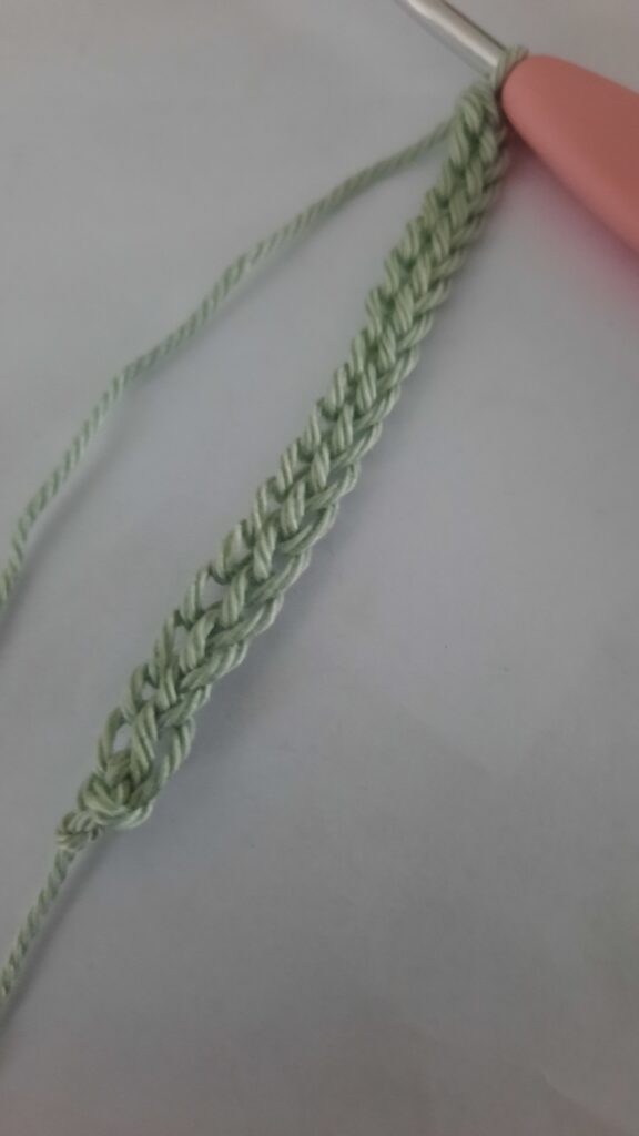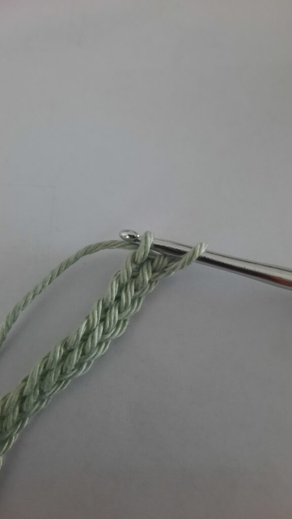 Hakend opzetten: haak twee lossen. Een vaste in eerste losse. Nu zie je twee lusjes, haal de draad door de lus het verst van de haaknaald en haak een vaste. Herhaal dit (zie foto’s)