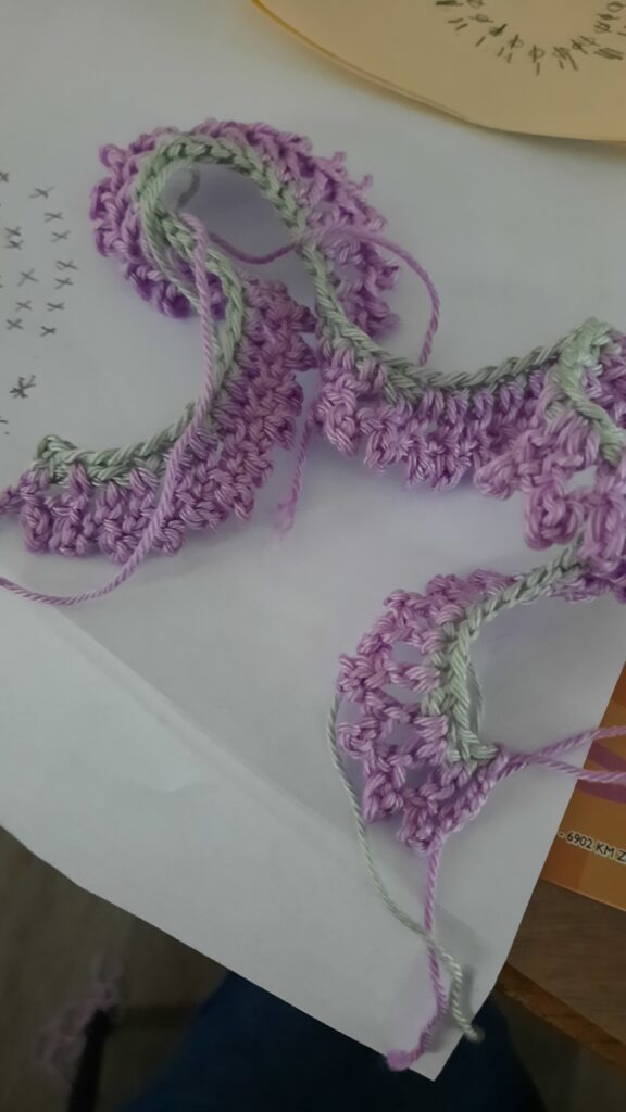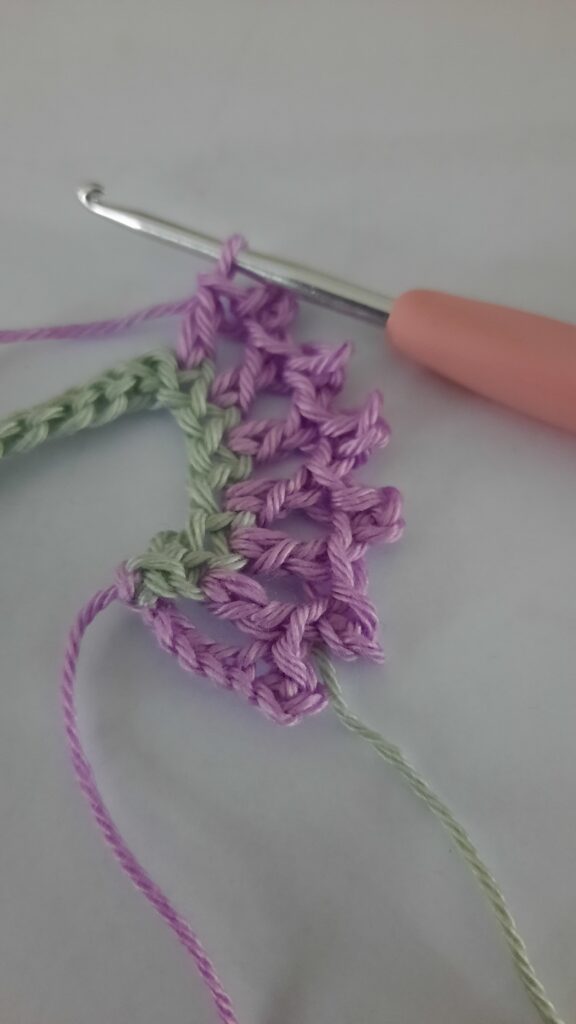2. Haak verder met paars. 6 l., 1 hv. In 3e vanaf haaknaald (dit is je eerste picot) 1 st. in volgende steek, *picot, 1 st. in volgende steek* herhaal *….* tot eind.