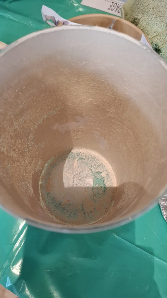 Op het laatst breng je een verflaag aan binnen in de vaas, dit kun je in één kleur doen. Wil je het in twee kleuren doen breng dan de eerste kleur dun, doorzichtig op. De tweede kleur vult dan de gaten op waardoor het gemeleerd lijkt.