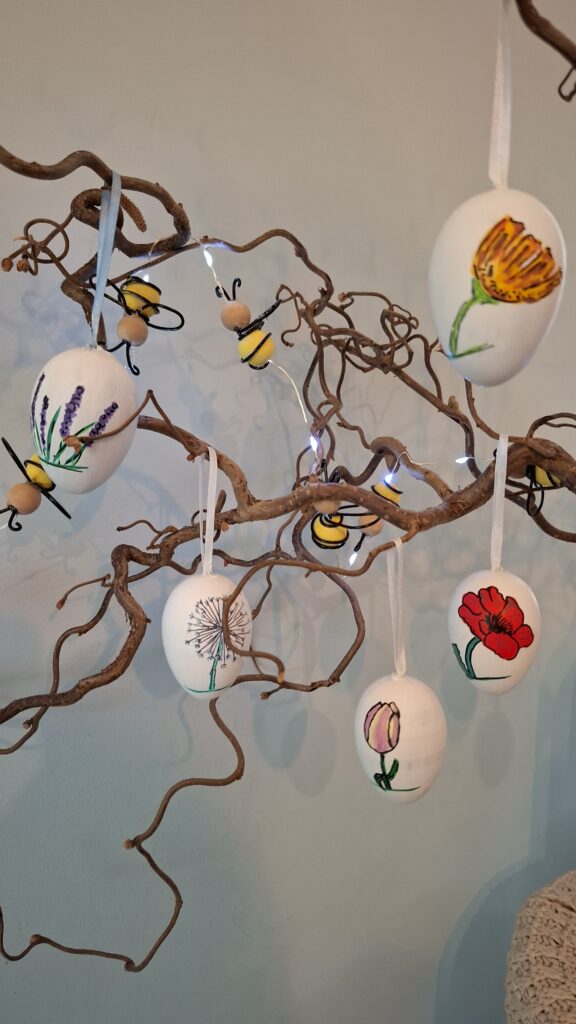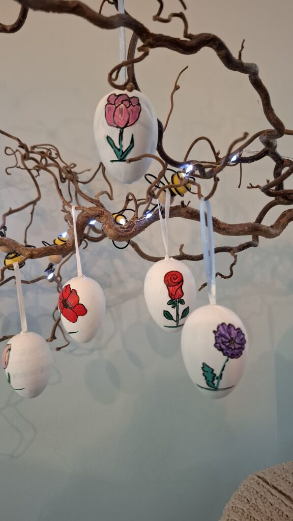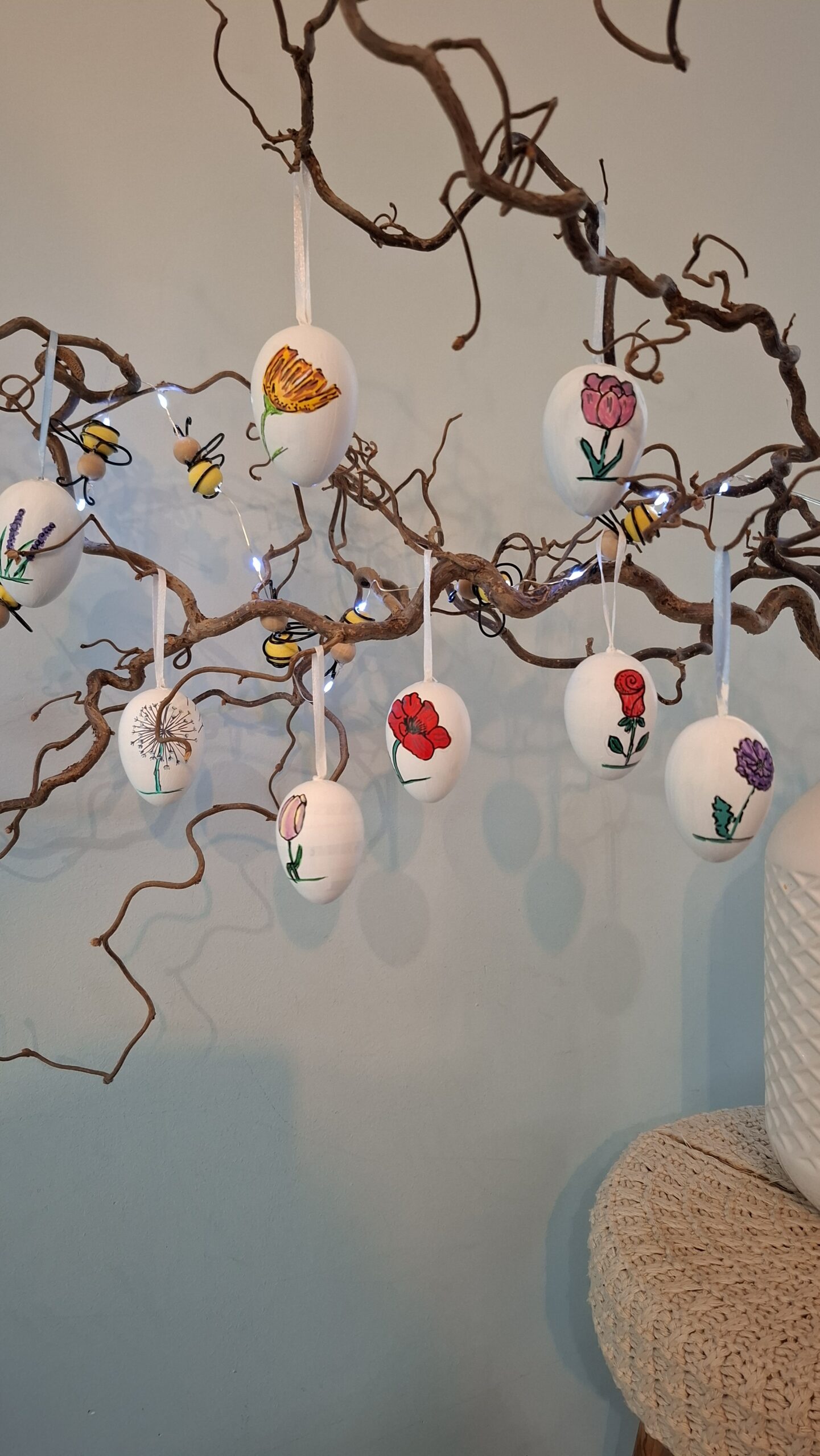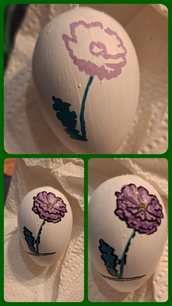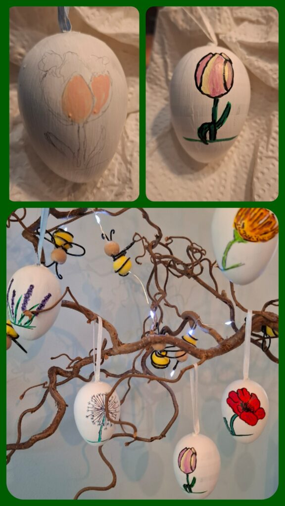 Het is vrij lastig witte eieren te kopen voor knutselen, plastic mag immers niet meer, piepschuim werkt niet goed in dit geval en echte eieren is ook wel wat. Ik tikte toch nog een doos met plastic eieren op de kop, maar moest die wel eerst wit zien te krijgen. Eerst een laag gesso en daarna witte verf. Dit is een goede basis voor acryylmarkers, maar minder geschikt om de verf in elkaar te laten vloeien. Uiteindelijk hangen er toch acht eieren met een bloem.