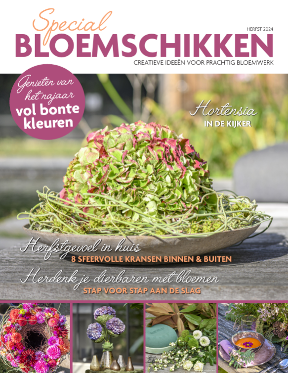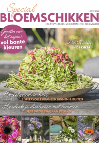 Ontdek Special Bloemschikken herfst 2024: In dit nummer halen we de zon naar binnen met een uitbundige kleurenpracht en rijke herfstmaterialen. Terwijl we uitkijken naar een stralende nazomer, zetten we hortensia’s in de kijker met verrassende kleurenmélanges die je direct een gevoel van geluk bezorgen. Ontdek tijdloze klassiekers, zoals zelfgemaakte kransen voor op tafel of aan de deur, en laat je inspireren door het intieme karakter van het najaar.