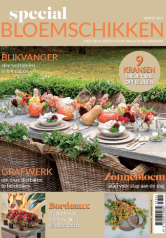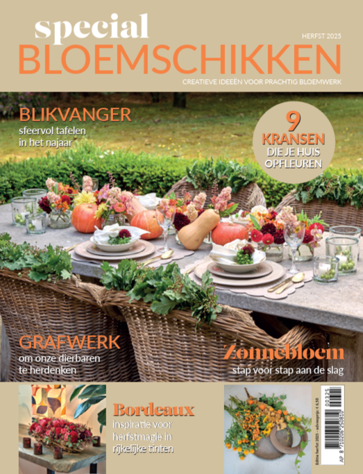 Ontdek Special Bloemschikken herfst 2025: In dit nummer omarmen we het prachtige kleurenpalet van het najaar met stralende zonnebloemen en rijkelijke bordeauxtinten. Van sfeervolle kransen voor binnen en buiten tot een bijzonder verslag van het Chrysantenfestival in de Japanse tuin van Hasselt; de herfst biedt volop inspiratie. Daarnaast is er extra aandacht voor ingetogen grafwerk en sfeervol gedekte tafels voor warme momenten met familie en vrienden.
