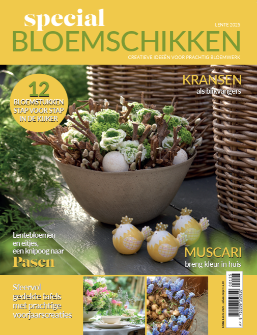 Ontdek Special Bloemschikken lente 2025: In dit nummer vieren we de start van het nieuwe seizoen en de feestelijke sfeer van Pasen. Laat je inspireren door kleurrijke bloemencreaties met stralend geel en charmante Muscari die je interieur én exterieur opfleuren. Ontdek hoe je gasten verbluft met een piekfijn gedekte tafel voor een brunch of etentje met extra cachet.