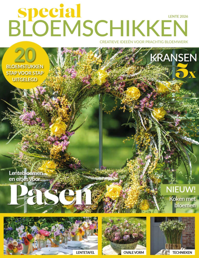 Ontdek Special Bloemschikken lente 2026: In dit nummer zetten we de lente op tafel met narcissen, tulpen en ranonkels. Van kleurrijke gipskruid-regenbogen tot stijlvolle kransen met kersenschors; de mogelijkheden zijn eindeloos. Natuurlijk ontbreken de paascreaties niet, inclusief sfeervolle nestjes en tafels in pastel- en wittinten. Met onze stap-voor-stap technieken, zoals klemmen en wikkelen, behaal je gegarandeerd een prachtig resultaat.